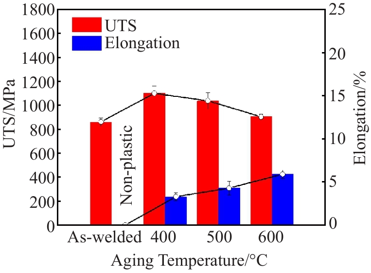 摘要:采用激光焊接近β钛合金(Ti-3Al-6Mo-2Fe-2Zr),并对激光焊接接头进行不同温度的时效处理,揭示了时效温度、显微组织和接头拉伸性能之间的关系。结果表明,由于该合金具有较高的Mo当量且激光焊接时冷却速度较快,焊缝主要由单一β相组成。时效处理后,在焊缝和热影响区中析出了大量的α相,随着时效温度的升高,α相粗化,体积分数降低。与焊态接头相比,时效处理后接头的抗拉伸强度和延伸率均有提升。但随时效温度的升高,α相的体积分数减少,强化效果减弱。当合金在500 ℃时效8 h时,接头获得了最佳的强度和塑性匹配。接头的断裂模式由焊态下的准解理断裂转变为时效处理后的微孔聚集型断裂。