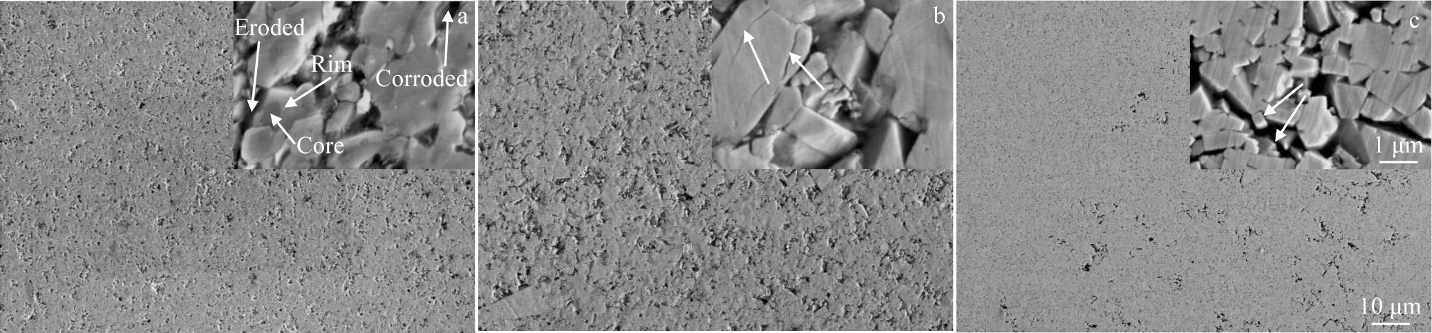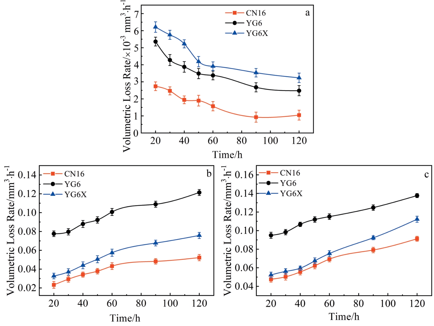 摘要:作为碱性条件下的抗磨蚀材料,WC-Co硬质合金所用的金属粘结剂Co属于可能致癌的物质,并且钴尘可引起“硬金属病”,因此有必要寻找可代替材料。采用Ti(C, N)-Mo2C-Ni金属陶瓷作为抗磨蚀材料,通过碱性条件下的电化学腐蚀和冲刷腐蚀,观察了这两种材料的微观组织变化,并比较了腐蚀速率及体积损失速率,分析了材料表面破坏和体积损失机制。结果表明,在NaOH溶液电化学腐蚀作用下,Ti(C, N)-Mo2C-Ni金属陶瓷呈现了钝化现象,其腐蚀表面的氧含量显著升高;金属陶瓷的腐蚀速率比硬质合金小一个数量级。在碱性的砂-水混合液冲刷腐蚀作用下,随冲刷时间增加,金属陶瓷和硬质合金的体积损失速率都缓慢增加。在冲刷过程中,金属陶瓷微观组织的环形相脆性大,裂纹容易穿过环形相,而芯相保持完整;中粒度硬质合金中穿晶断裂模式较为常见;细粒度硬质合金中裂纹多沿相界扩展。金属陶瓷和硬质合金在碱性的砂-水混合液冲刷腐蚀过程中,砂粒冲刷磨损破坏作用是主要的。碱性的砂-水混合液冲刷腐蚀是腐蚀与冲刷两种作用相互影响、相互促进的加速破坏过程。已证实,采用金属陶瓷代替硬质合金作为碱性条件的抗磨蚀材料是可行的,且具有一定的优势。