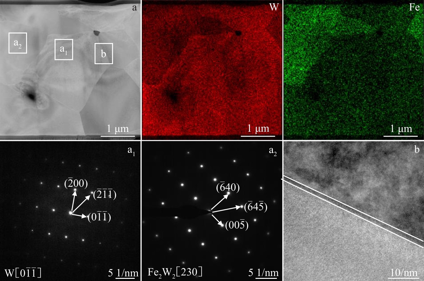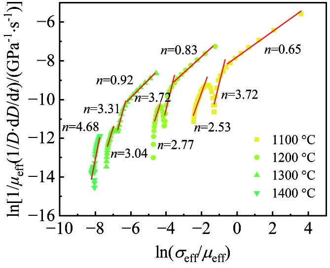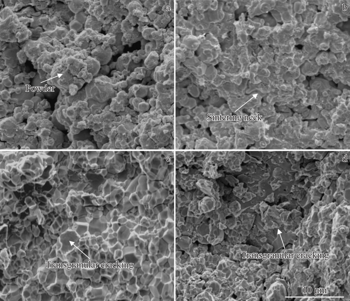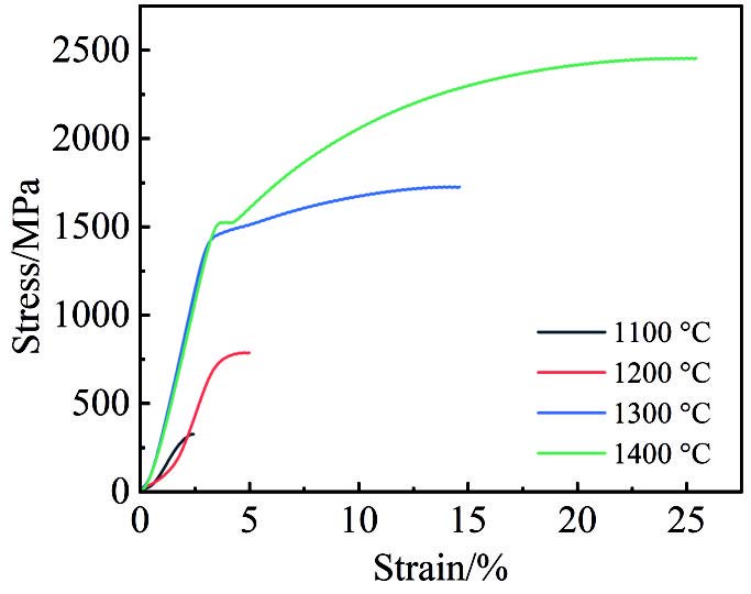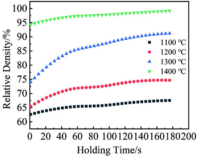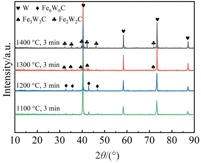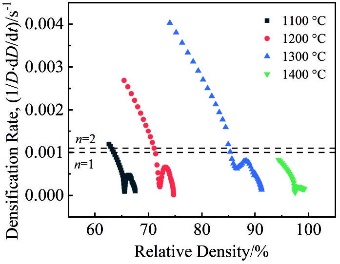 Abstract:The W-Fe-C composites were prepared using spark plasma sintering at various sintering temperatures, and their sintering behavior, phases, microstructure, and mechanical properties were characterized. The densification mechanism was also analyzed. The results show that as the temperature increases, the reinforcement phase in the composite transitions from Fe6W6C to Fe3W3C, and finally to Fe2W2C. After sintering at 1400 ℃, the sample achieves a relative density of 99.2%, with an ultimate compressive strength of 2455.15 MPa and a deformation rate of 25.42%. During the holding stage, the W-Fe-C composite exhibits a unique creep recovery stage, where the densification rate is nearly zero. When the effective stress exponent (n) is approximately 1 and 2, the estimated activation energies are 341.27 and 1005.73 kJ/mol, respectively, which are higher than those of pure tungsten. However, because the in-situ reaction promotes diffusion, the relative density of the W-Fe-C composites exceeds that of pure tungsten. This study provides a new approach for the low-temperature fabrication of tungsten-based composites.