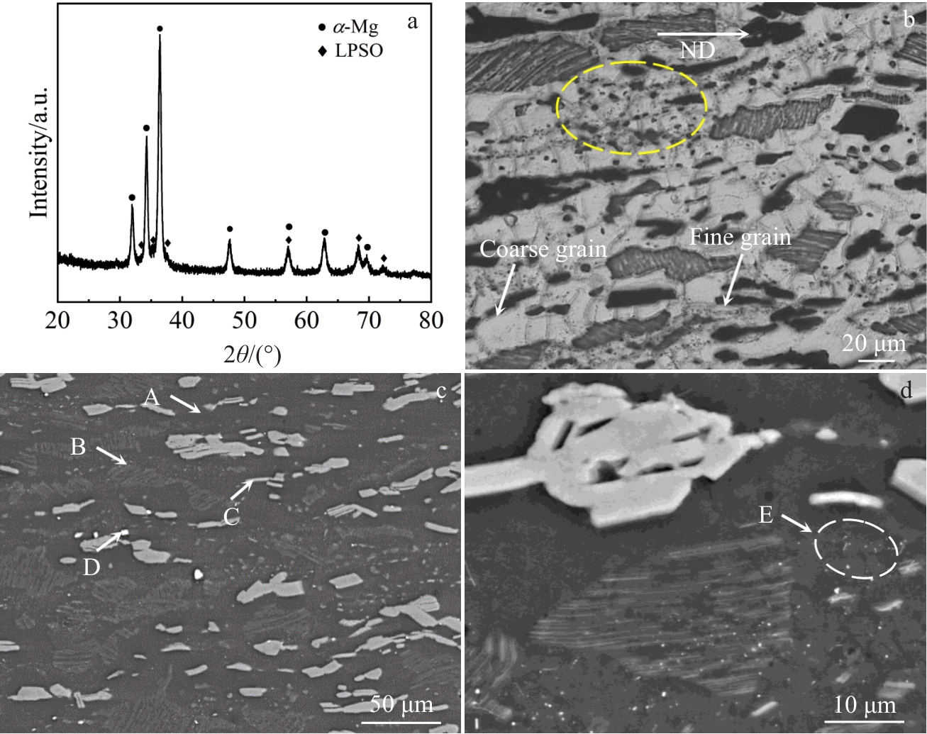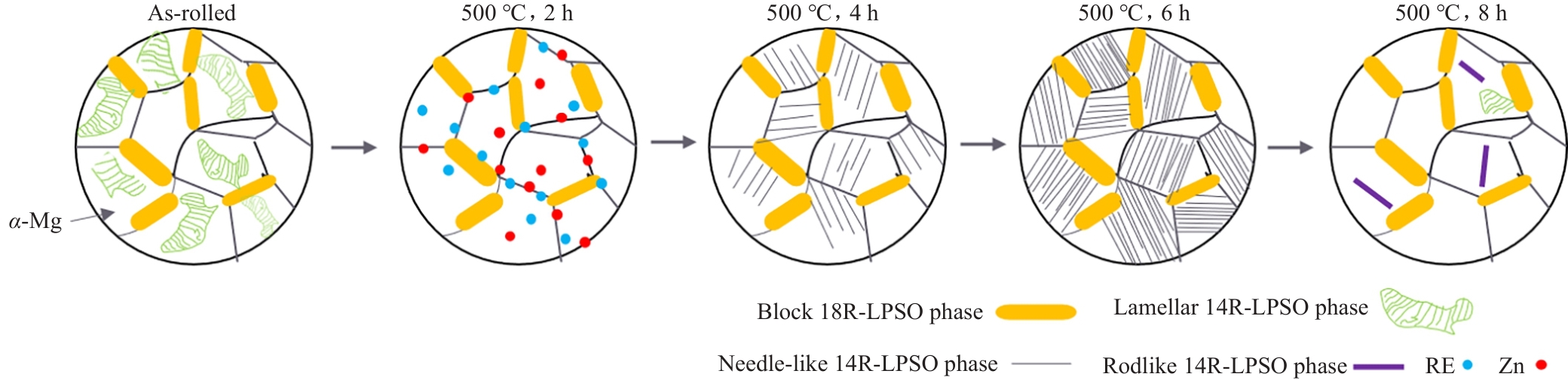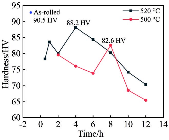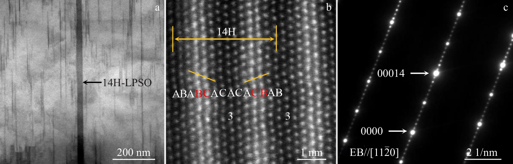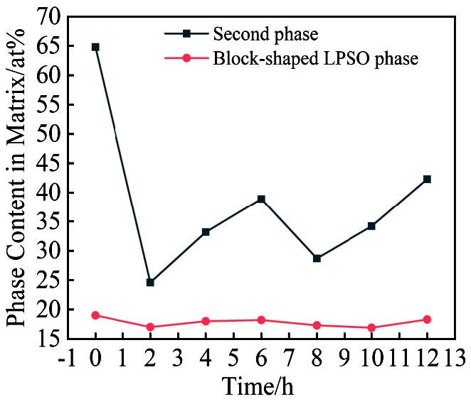Abstract:The effects of solid solution and aging treatments on the microstructural evolution and hardness of the GWZ932 alloy in the rolled state were investigated by means of optical microscope, X-ray diffractometer, Vickers hardness tester, scanning electron microscope, transmission electron microscope, and high-angle annular dark-field scanning transmission electron microscope. The results show that the alloy microstructure in the rolled state mainly consists of α-Mg, massive 18R-LPSO phase, lamellar 14H-LPSO phase, rare-earth-rich phase and Zn-Zr phase. The lamellar 14H-LPSO is almost completely dissolved into the matrix by solid solution treatment at 500 ℃ for 2 h; the elongated acicular 14H-LPSO is precipitated from the α-Mg matrix after 4 h of solid solution, and its volume fraction gradually increases with the extension of time; the volume fraction of acicular 14H-LPSO reaches 16% after 6 h of solid solution; the acicular 14H-LPSO phase dissolves and re-precipitates the lamellar 14H-LPSO (about 14.9 μm in length and 8.2 μm in width), and a small amount of undissolved acicular 14H-LPSO phase grows to form rod-like 14H-LPSO (23.4 μm in length and 1.98 μm in width). Increasing the solid solution temperature to 520 ℃, the solute atom diffusion rate is accelerated, thus the complete dissolution and re-precipitation time of lamellar 14H-LPSO is advanced to 1 and 2 h, respectively, and the size of the re-precipitated lamellar 14H-LPSO phase (12.6 μm in length, 5.1 μm in width) is smaller than that of the re-precipitated one after solid solution at 500 ℃ for 8 h. Precipitation and transformation do not occur during solid solution treatment at 520 ℃, indicating that the precipitation and dissolution of the acicular 14H-LPSO phase and its content are affected by the solid solution temperature and time. The age-hardening curves reach peak hardness under conditions of 520 ℃, 4 h+225 ℃, 64 h. On this basis, the age-hardening behaviour of the alloy after solution treatment at 520 ℃ for 4 h was investigated and the results show that the alloy reaches peak hardness after age treatment at 225 ℃ for 64 h. The room-temperature tensile strength (UTS), yield strength (YS) and elongation (EL) of the alloy under peak aging conditions are 396.3 MPa, 274 MPa, and 12.7% increase by 23.8%, 7.4%, and 69.3%, compared to those of the rolled state, respectively. The excellent strength and plasticity of the alloys arise from the precipitation of a columnar β'' phase (about 28.9 nm in length and 8.9 nm in width with an average area fraction of about 11.7%) and a basal 18R-LPSO/γ'' phase in the α-Mg matrix.