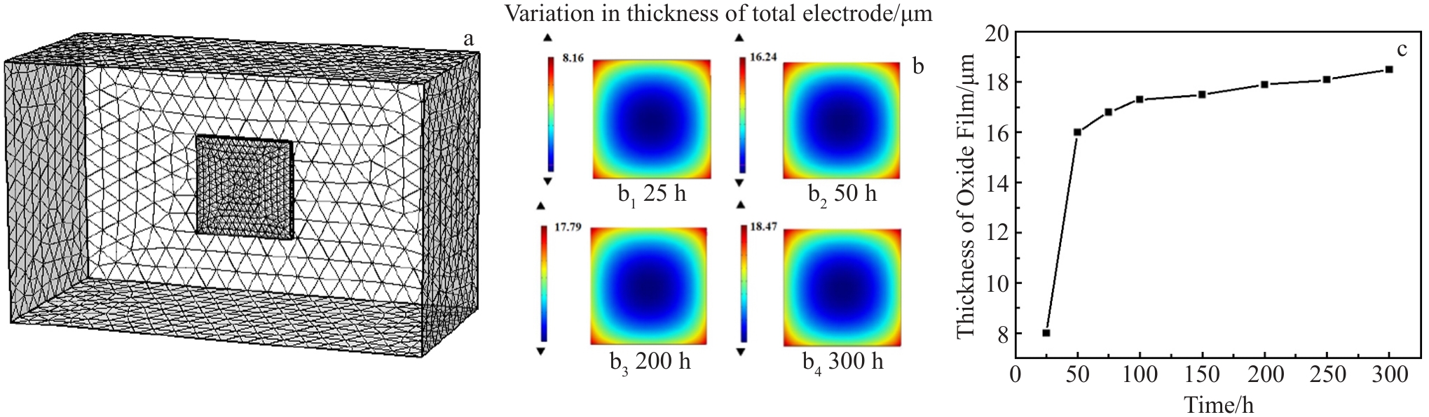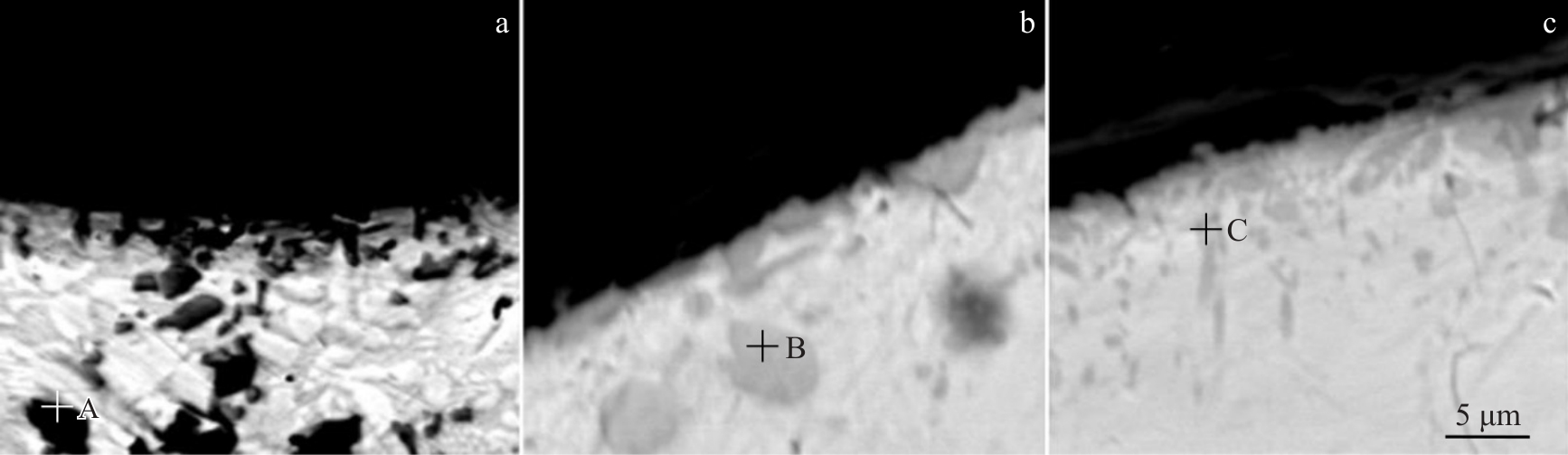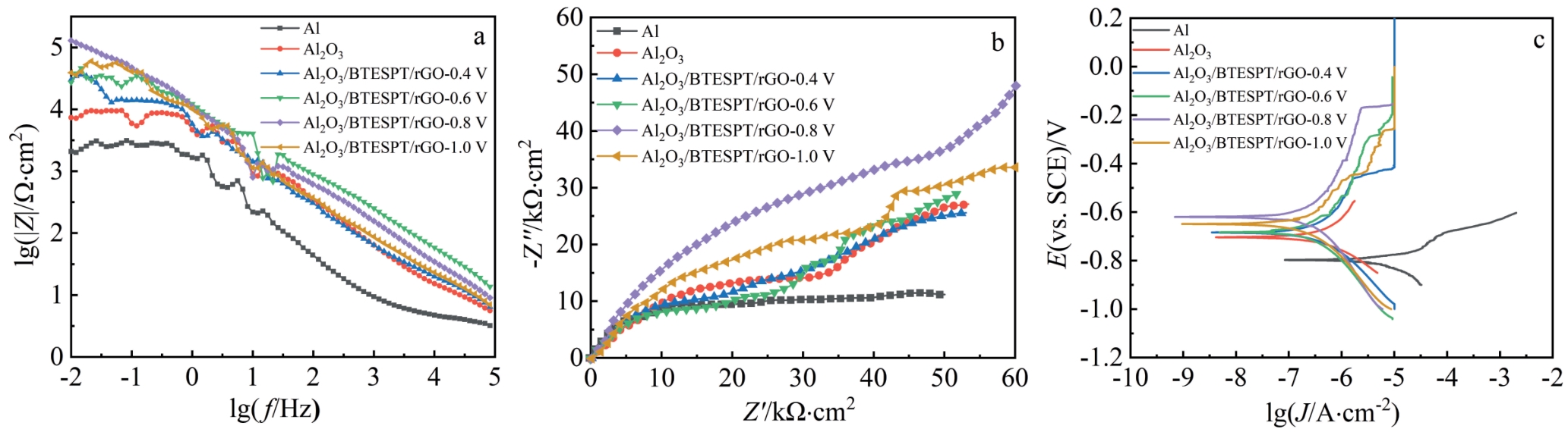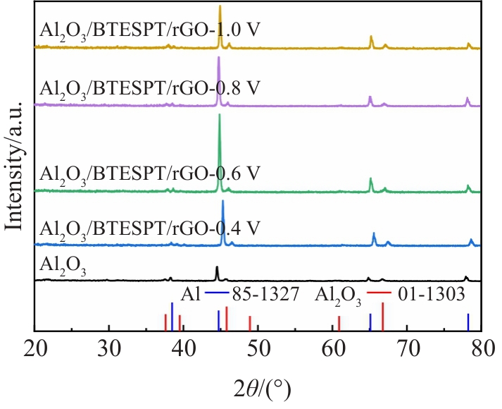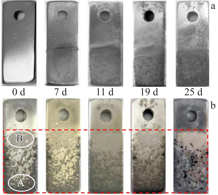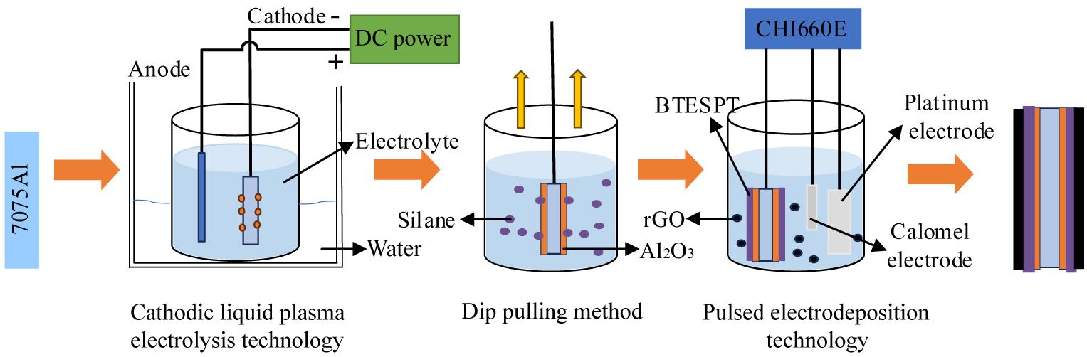 Abstract:To improve the long-term corrosion resistance of 7075Al aluminum alloy, an alumina (Al2O3) coating was prepared first by cathodic liquid plasma electrolysis technology to achieve full coverage of the aluminum alloy substrate, and then a bis[3-(triethoxysilyl)propyl]tetrasulfide (BTESPT) silane coating and reduced graphene oxide (rGO) coating (BTESPT/rGO composite coating) was further prepared on the surface of the Al2O3 coating via dip coating and pulsed electrodeposition technology to fill the micro-cracks and micro-holes in the Al2O3 coating, further improving the long-term corrosion resistance of 7075Al alloy. The phase composition, surface morphology, electrochemical properties, impedance value and macroscopic surface morphology of the deposited coatings were analyzed. The results indicate that the impedance value of 7075Al coated with a single Al2O3 coating is still 4.6 Ω·cm2 after immersion in seawater for 25 d, which is significantly higher than 3.2 Ω·cm2 of 7075Al alloy. However, several etch pits are formed on the Al2O3 coating because the oxygen and chloride ions in seawater enter the interior of 7075Al alloy through the micro-cracks and micro-pores in the Al2O3 coating. In contrast, the uniform and dense Al2O3/BTESPT/rGO composite coating, prepared by the pulsed electrodeposition technique at 0.8 V deposition voltage, fills the micro-cracks and micro-pores generated in the process of Al2O3 coating deposition. The 7075Al alloy coated with the composite coating exhibit the most positive corrosion potential and the lowest corrosion current density, indicating the lowest corrosion tendency and corrosion rate. Throughout the period of immersion in seawater for 105 d, the impedance value of 7075Al coated with Al2O3/BTESPT/rGO composite coating varies within the range between 5.44 Ω·cm2 and 5.71 Ω·cm2. Furthermore, the Al2O3/BTESPT/rGO composite coating exhibits only slight color change on its surface, demonstrating excellent long-term corrosion resistance in seawater.