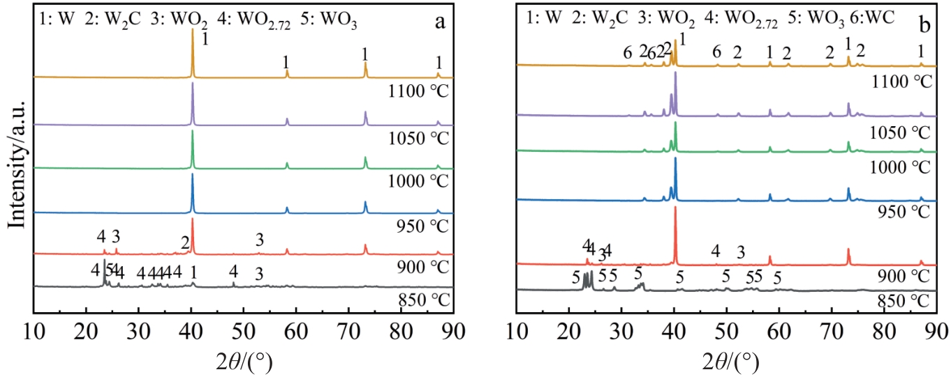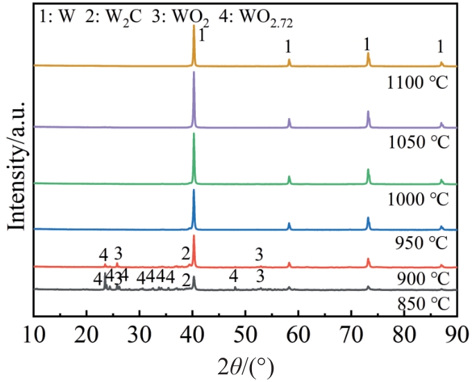 Abstract:High-quality nano-tungsten powder is the prerequisite for the preparation of high-performance nanocrystalline tungsten alloys and cemented carbides. The tungsten powder prepared by hydrogen reduction produces WO2(OH)2, which leads to the growth of tungsten powder grains. The carbothermal reduction method can effectively avoid this problem. This study focused on the influence of carbothermal reduction temperature, atmosphere, time and dynamic/static process on the phase structure and particle size of the product. The results show that the purity of the product in vacuum atmosphere is higher than that in argon atmosphere. With the increase of reduction temperature, the product changes from high-valence tungsten oxide to low-valence tungsten oxide and finally to pure tungsten. When the holding time is 1 h, the average particle size of tungsten powder increases from 67 nm to 118 nm with the increase in reduction temperature from 1000 ℃ to 1100 ℃. When the reduction temperature is 1000 ℃, the average particle size of tungsten powder increases from 67 nm to 93 nm with the prolongation of holding time from 1 h to 3 h. Nano-tungsten powder with an average particle size of 67 nm can be prepared under the vacuum dynamic carbothermal reduction at 1000 ℃ for 1 h.