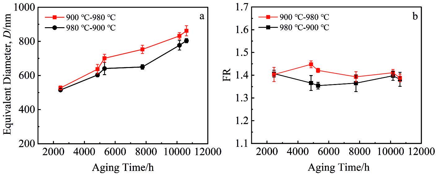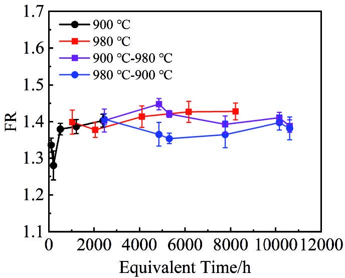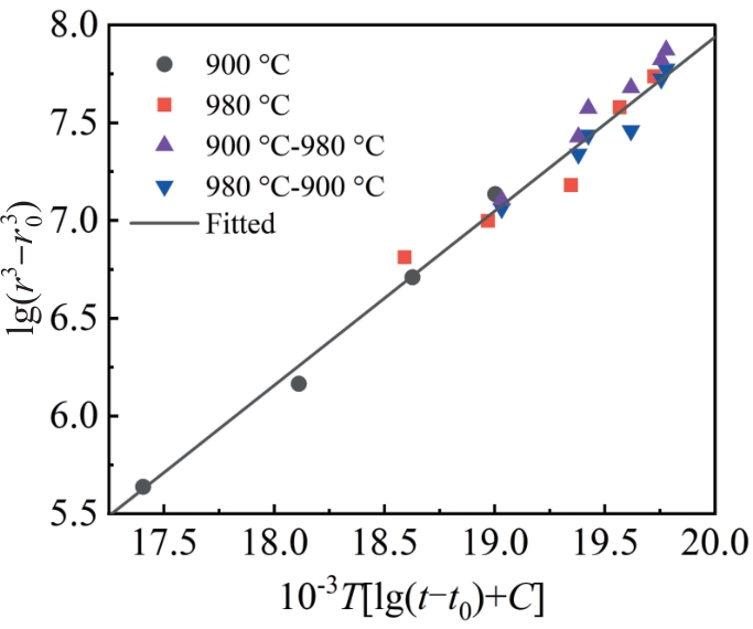 Abstract:Nickel-based alloys undergo complex temperature variations during actual service. Thermal fluctuations may alter elemental diffusion pathways and rates, thereby affecting microstructural homogeneity. Current long-term aging studies predominantly focus on isothermal conditions, while microstructural evolution and performance degradation under non-isothermal aging remain inadequately explored. This study aims to investigate the differences in γ′ phase evolution between isothermal and non-isothermal aging in nickel-based alloys, elucidate the influence of variable temperature sequences on microstructural characteristics, and establish quantitative relationships among microstructure, aging time, and temperature, including equivalent time calculations. The results reveal that the growth kinetics of γ′ phase size in DZ411 alloy under both non-isothermal and isothermal aging follows an identical time-temperature function: the cube of phase diameter exhibits a linear dependence on aging time and temperature, with Feret ratio (FR) fluctuating within comparable ranges. Furthermore, variable temperature sequences systematically govern γ′ phase dimensions. Microstructural observations demonstrate that sequential aging from 900 ℃ to 980 ℃ produces larger γ′ phases than the reverse sequence (980 ℃-900 ℃). Quantitative analysis confirms that the average equivalent diameter (D) for the 900 ℃-980 ℃ sequence is 719 nm, which is larger than that for the 980 ℃-900 ℃ sequence (665 nm). Additionally, variable temperature sequences regulate γ′ phase morphology: rounded rectangular particles dominate in the 900 ℃-980 ℃ sequence, while near-spherical shapes prevail in the 980 ℃-900 ℃ sequence, supported by distinct FR values (1.411 vs. 1.379).