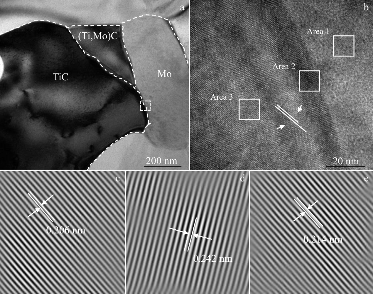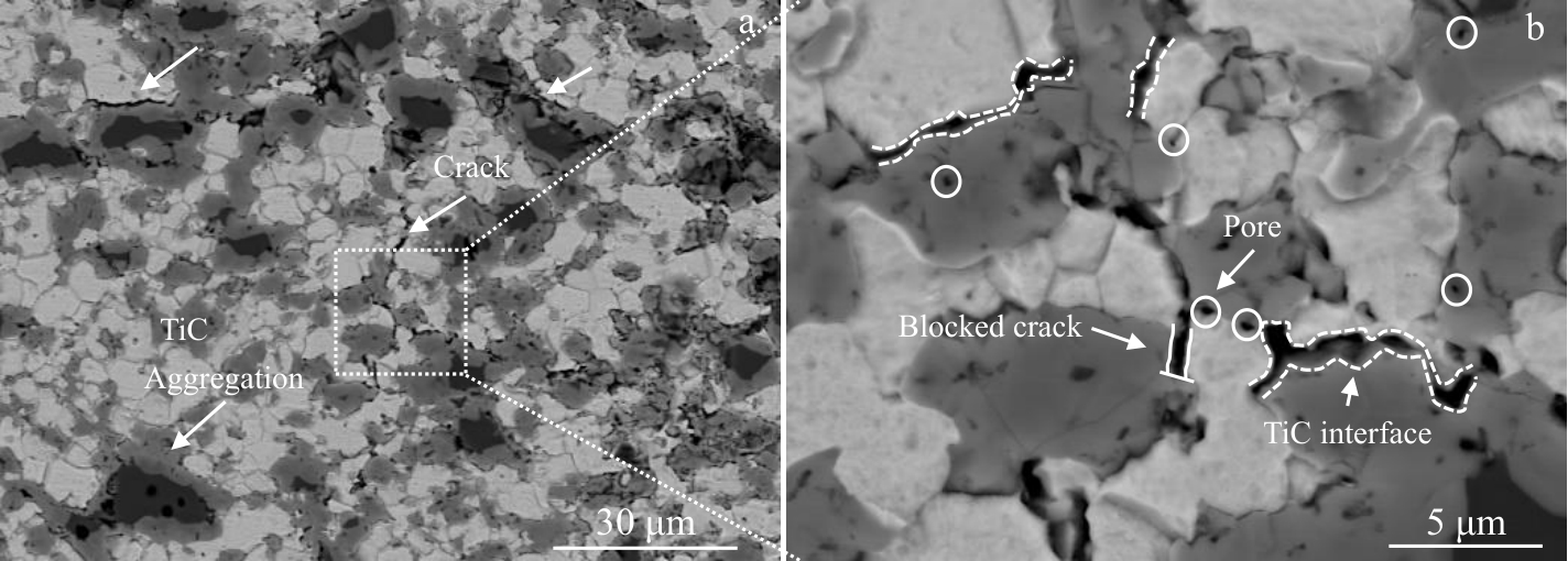Abstract:The influence of titanium carbide (TiC) content on the microstructure and mechanical properties of molybdenum (Mo)-based composites was investigated, aiming to provide a scientific basis for the development of high-performance and heat-resistant molybdenum materials for aerospace engines. TiC/Mo composites containing 10wt%, 20wt%, and 30wt% TiC were prepared using spark plasma sintering (SPS) technique. The results indicate that the strengthening mechanisms of TiC/Mo composites are primarily attributed to intragranular particle strengthening and grain boundary strengthening. At elevated temperatures, TiC diffuses into the Mo matrix, forming a transition zone of measurable width at the interface of the two phases. XRD analysis confirms that this transition zone comprises (Ti, Mo)C. The crystal lattices of the TiC and Mo phases exhibit strong bonding, which is further corroborated by atomic-scale observations. Tensile and hardness tests reveal that TiC/Mo composites with 10wt% and 20wt% TiC demonstrate superior mechanical properties. The fracture behavior of these composites is primarily governed by the propagation of intergranular microcracks, which is influenced by the competition between intergranular and intragranular crack development. This study provides critical insights into the coupling effects of intergranular and intragranular TiC particles on the mechanical performance of TiC/Mo composites.
