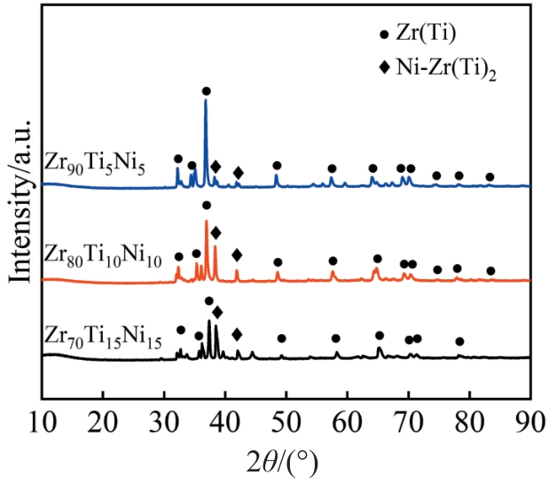 Abstract:ZrTiNi system exhibits unique low-temperature hot-melting characteristics and high chemical reactivity potential, offering promising applications in energetic warhead casings. This research presents a preliminary exploration of the low-temperature liquid phase region of ZrTiNi based on ternary phase diagram calculations. ZrTiNi alloy bulk samples with varying Zr contents (70wt%, 80wt%, and 90wt%) were prepared using a vacuum sintering process, and the microstructure, phase composition, quasi-static mechanical properties, and impact-induced reaction characteristics were studied. Results show that according to the phase diagram calculations, the ZrTiNi system has a wide liquid phase region at 900, 950, and 1000 ℃, demonstrating significant low-temperature hot-melting characteristics. Relative density and metallographic analysis results show that the Zr70Ti15Ni15 and Zr80Ti10Ni10 alloy samples sintered at 950 ℃ achieved near-full densification, while the Zr90Ti5Ni5 alloy sample has a relative density of only 81.7%, with numerous pore defects remaining in the cross-section. This indicates that as the Zr content increases, the overall melting point of the alloy rises. XRD and SEM analysis results show that the ZrTiNi alloys consist mainly of Zr(Ti) solid solution as the primary phase and Ni-Zr(Ti) intermetallic compounds. Additionally, increasing Zr content promotes the formation of Zr-rich solid solution phases, which inhibits the formation of intermetallic compounds to some extent. Quasi-static compression tests reveal that both the densified Zr70Ti15Ni15 and Zr80Ti10Ni10 alloy samples have compressive strengths exceeding 1200 MPa, providing a solid foundation for blast loading resistance and armor-piercing penetration. In ballistic gun tests, the Zr80Ti10Ni10 alloy projectile successfully penetrated the front steel plate at a velocity of 1029 m/s and sustained the ignition of jet fuel, demonstrating excellent impact-induced ignition properties.