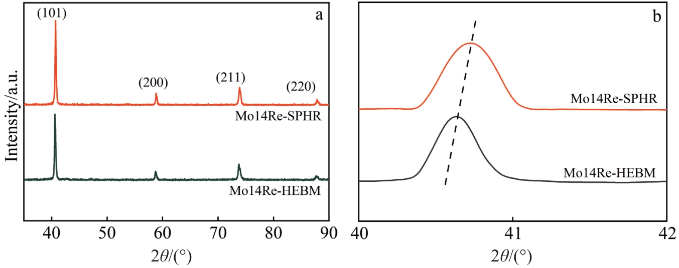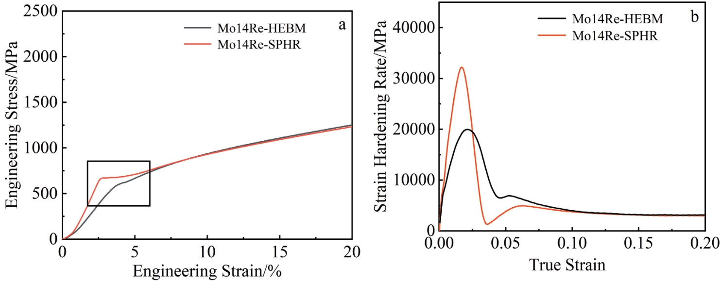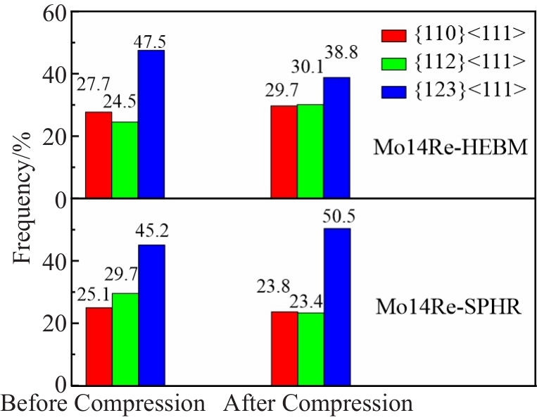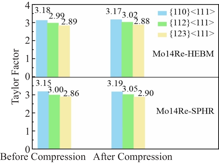 Abstract:Mo14Re powders were prepared by high-energy ball milling (HEBM) and spray drying-hydrogen reduction (SPHR), separately. Then, the Mo14Re alloys were obtained by spark plasma sintering (SPS). The phase structure, microstructure, element distribution, and grain size were analyzed using X-ray diffraction (XRD), scanning electron microscopy (SEM), and electron backscatter diffraction (EBSD). The deformation mechanisms of Mo14Re alloy under room temperature tension and compression were discussed. The XRD results indicate that the (101)-spacing of the Mo14Re-SPHR is smaller than that of the Mo14Re-HEBM. The EDS results show that the segregation of Re is observed at the grain boundary of the Mo14Re-HEBM, while uniform elements distribution in the Mo14Re-SPHR alloy. The room temperature compression results show that the compressive yield strength of the Mo14Re-SPHR is 679.11 MPa, higher than that of the Mo14Re-HEBM (602.71 MPa). EBSD results show that when the compression deformation is larger than 5.0%, the proportion of grains with {123}<111> as the main slip system in Mo14Re-SPHR increases, while the proportion of grains with {110}<111>and {112}<111> as the main slip systems decreases. The change trend of the three slip systems in Mo14Re-HEBM is opposite to that in Mo14Re-SPHR, resulting in a strain hardening rate of Mo14Re-HEBM higher than that of Mo14Re-SPHR. Room temperature tensile results show that Mo14Re-SPHR exhibits better plasticity and toughness.