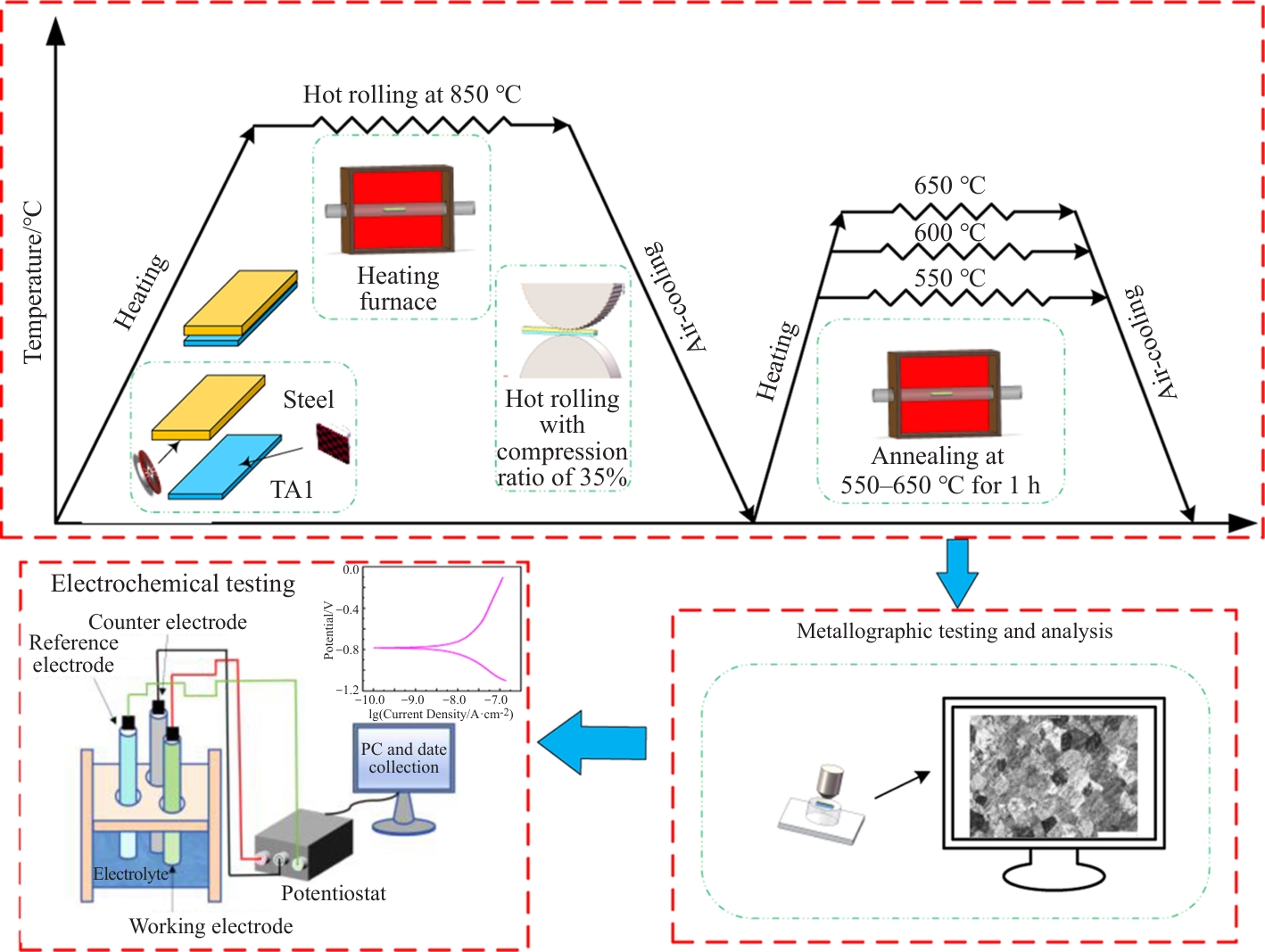 Abstract:The corrosion resistance and corrosion mechanism of TA1/304 composite plates after heat treatment at different temperatures were studied by simulating electrochemical experiments in artificial seawater (3.5wt% NaCl solution). The interfacial diffusion and microstructure evolution were studied. The results show that the diffusion range of interfacial elements and the thickness of the diffusion layer change with the heating temperatures. Because of its special structure and composition, the TA1/304 composite plate shows excellent corrosion resistance in Cl--containing corrosive media, and its corrosion resistance is significantly better than that of ordinary steel plates. Meanwhile, it is found that the heat treatment process of the composite plate has a significant impact on its corrosion resistance. After annealing at 600 °C, the corrosion resistance of the composite plate is improved, and corrosion properties of rolled surface is much greater than that of the cross-section. This research achievement provides important theoretical basis and technical support for the further application of TA1/304 composite plates in fields with strict corrosion resistance requirements, such as chemical engineering and marine engineering.