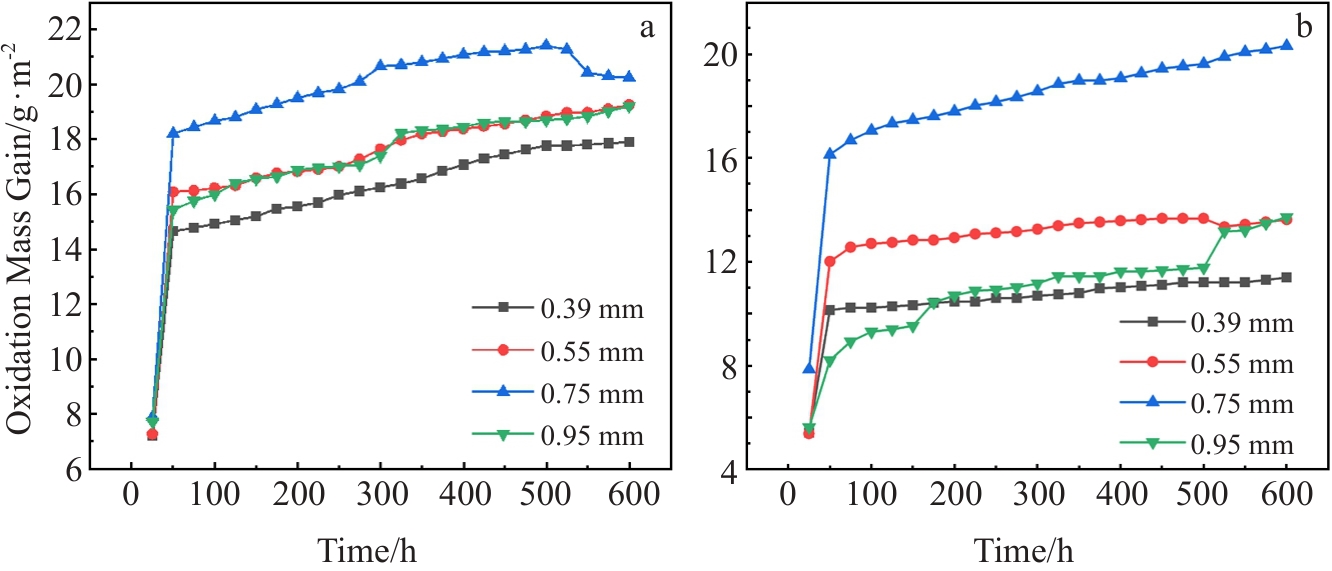 Abstract:The isothermal oxidation behavior of DD6 single-crystal superalloy with different hole geometric structure at 1050 ℃ was studied using field emission scanning electron microscope, energy dispersive spectroscope, X-ray diffractometer, and ABAQUS finite element method. The results show that at two angles of 45° and 90°, the average oxidation rate varies with the film-hole spacing, both being 0.75 mm>0.95 mm>0.55 mm>0.39 mm. The effect of film-hole spacing on the oxidation mass gain of single-crystal superalloys is more significant than that of hole angle. At the same film-hole spacing, the degree of oxidation at 45° is relatively more severe than that at 90°. Finite element analysis shows that the growth of the oxide layer on the inner wall of the hole is mainly affected by the temperature field, while the growth of the oxide layer on the surface of the hole is mainly affected by the detachment stress. As the film-hole spacing increases, the stress cancellation area gradually decreases, and the detachment stress continues to increase, reaching its peak at 0.75 mm. At this time, the oxide film detachment is most severe, and after the peak point, it shows a downward trend.